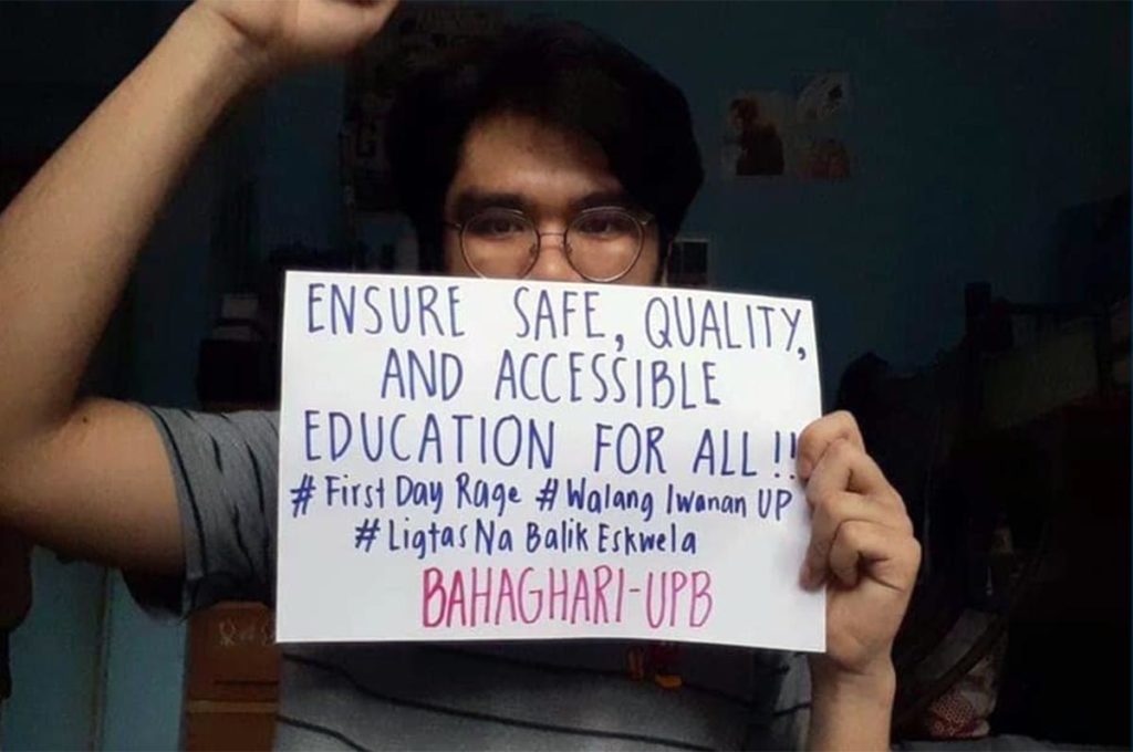 LGBTQ+ UNITED. A member of an LGBTQ+ organization in UP Baguio joins the online action to demand proactive steps from the government to ensure that no students are left behind the learning process during the COVID-19 pandemic. Photo from ACS UP Baguio.