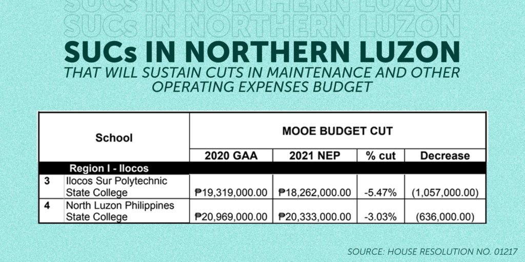The Ilocos Sur Polytechnic State College (ISPSC) and North Luzon Philippines State College (NLPSC) in the Ilocos Region. The two SUCs will sustain a P1.06 million and P636,000 decrease in their MOOE, respectively.