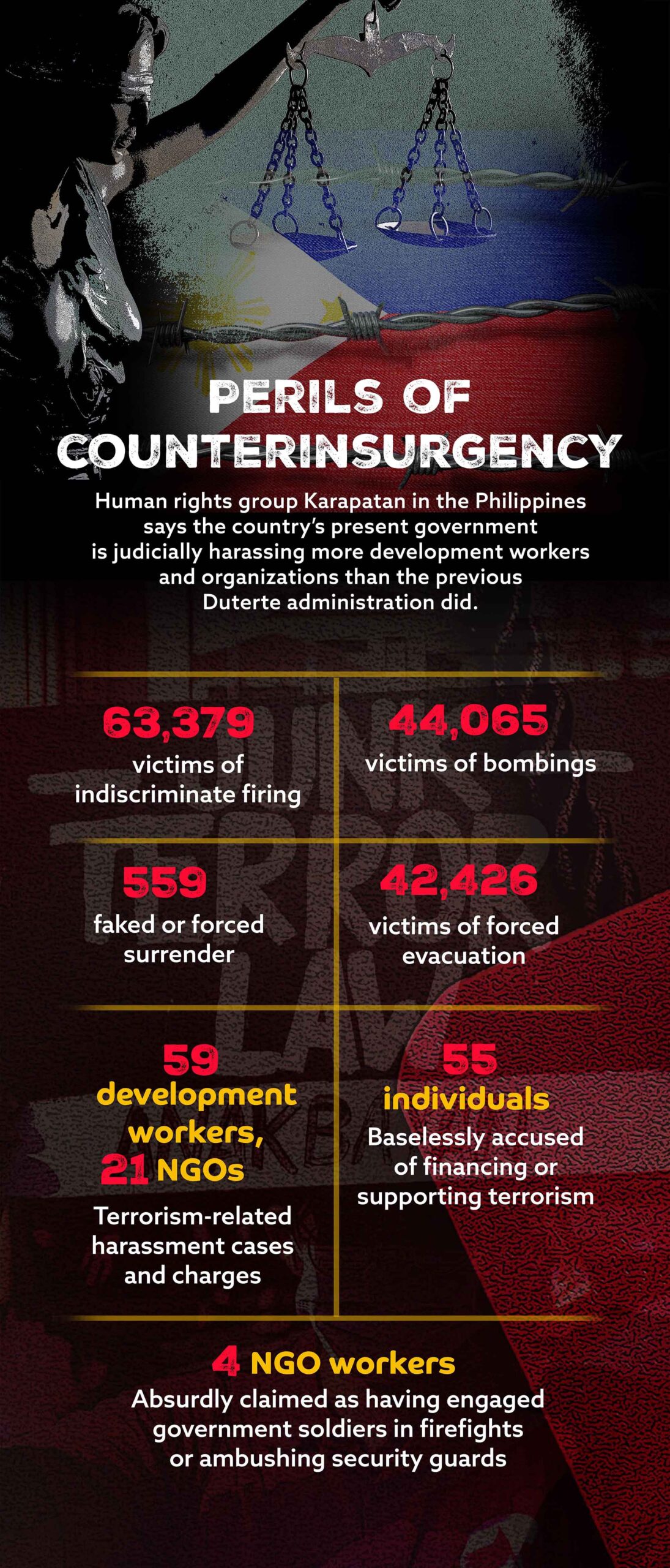 Authorities have accused not only rights advocates, journalists, and nongovernment organizations (NGOs) of supporting the underground communist movement. Also being haled to court on similar charges are lawyers, members of the religious community, medical professionals, and even farmers and fisherfolk.