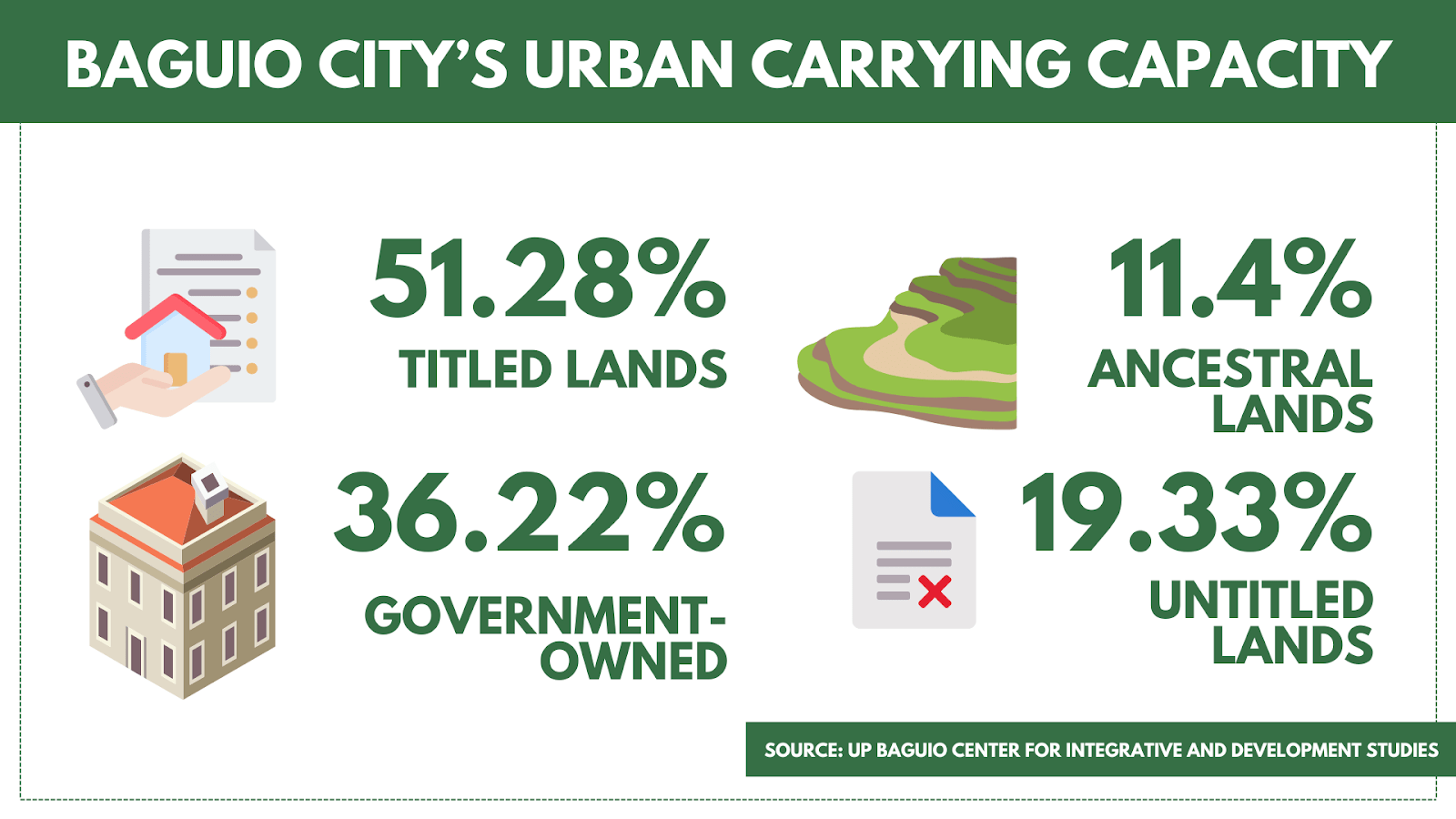 In September 2024, during UP Baguio’s public forum on the city’s carrying capacity, the City Planning, Development, and Sustainability Office (CPDSO) noted that only 51.28% of the lots are titled, 36.22% are government-owned, 11.4% are ancestral lands, and 19.33% are untitled. This totals around 118% of the titled lots, indicating overlapping land ownership.