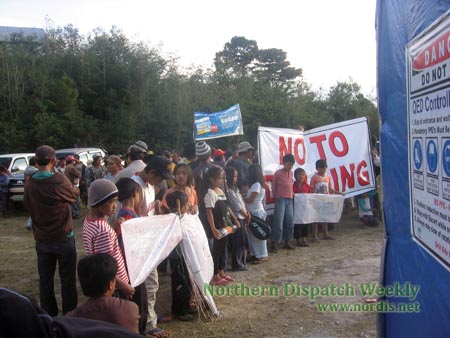 FILE PHOTO. Residents of Madaymen, Tabio, Mankayan, Benguet established a human barricade that stopped the drilling activities of Gold Fields. The drilling activities are allegedly conducted without the residents’ consent. (APIT TAKO)